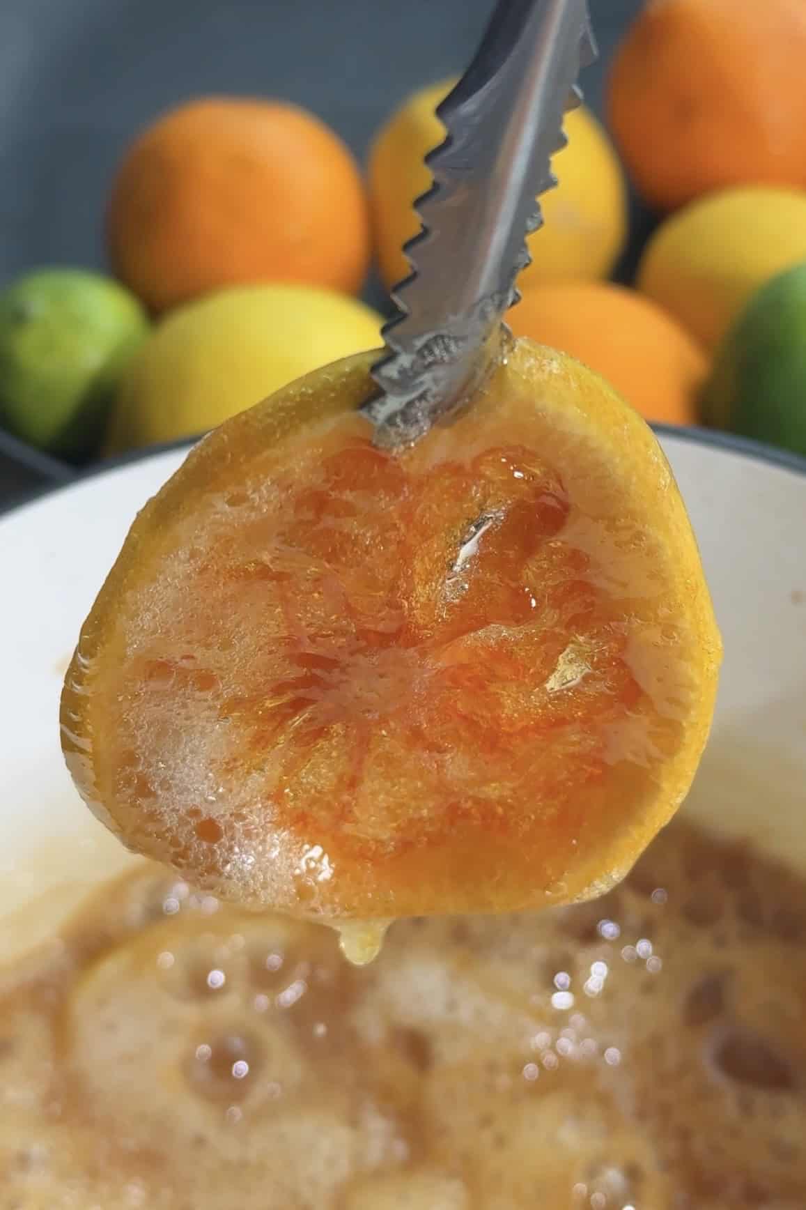 - Once the syrup has reduced and reached a temperature of 218-220F/104C (this should take about 20 minutes using a gas stove), place the citrus slices in the syrup.
