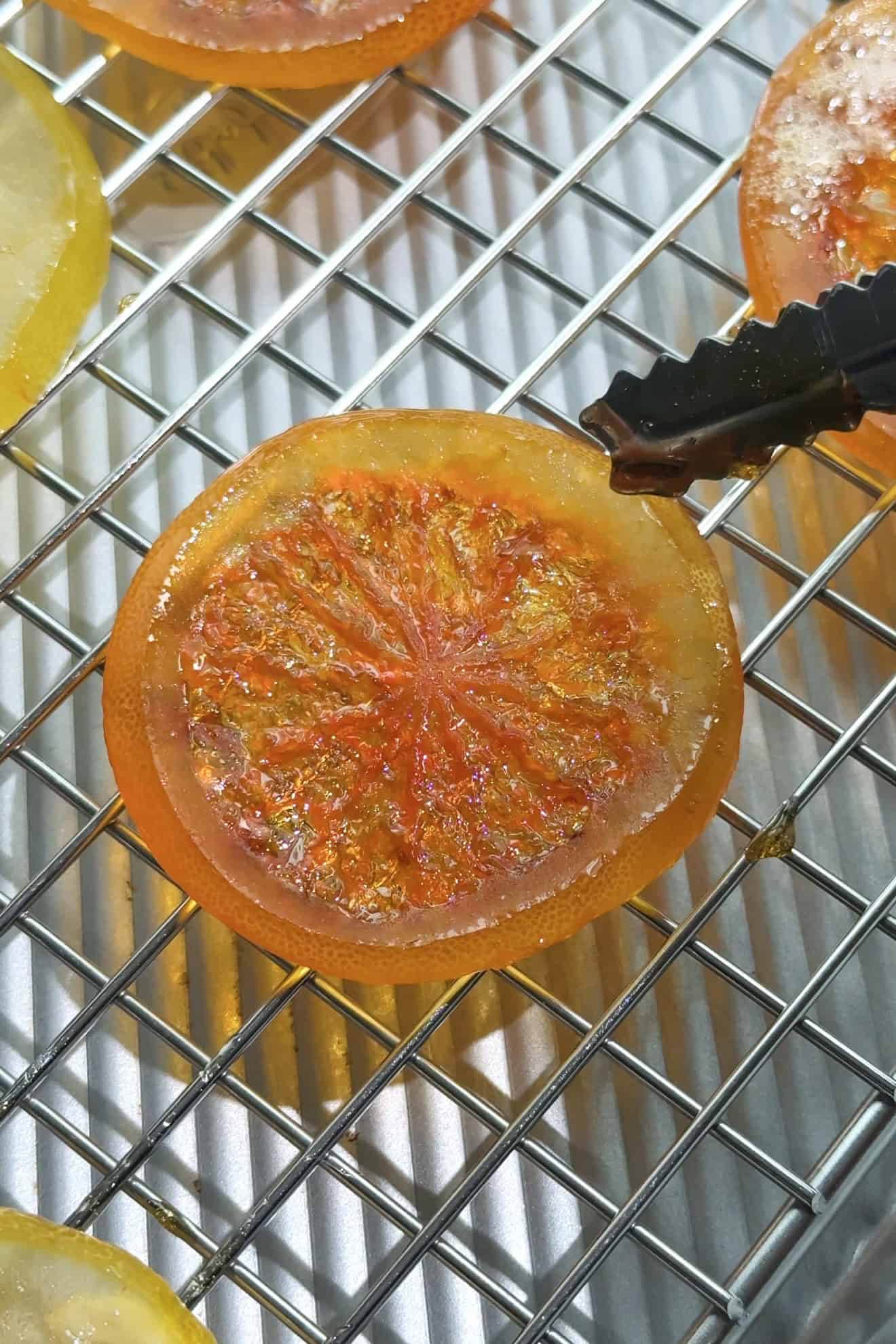 Step 5: Cook. Continue to heat the syrup and grapefruit slices until it reaches 245F, then turn off the heat. Remove the grapefruit slices one by one from the grapefruit sugar syrup using a fork, food tweezers or a utensil that feels natural to you and place each slice in a single layer on the prepared wire rack layered on a baking sheet for best results.