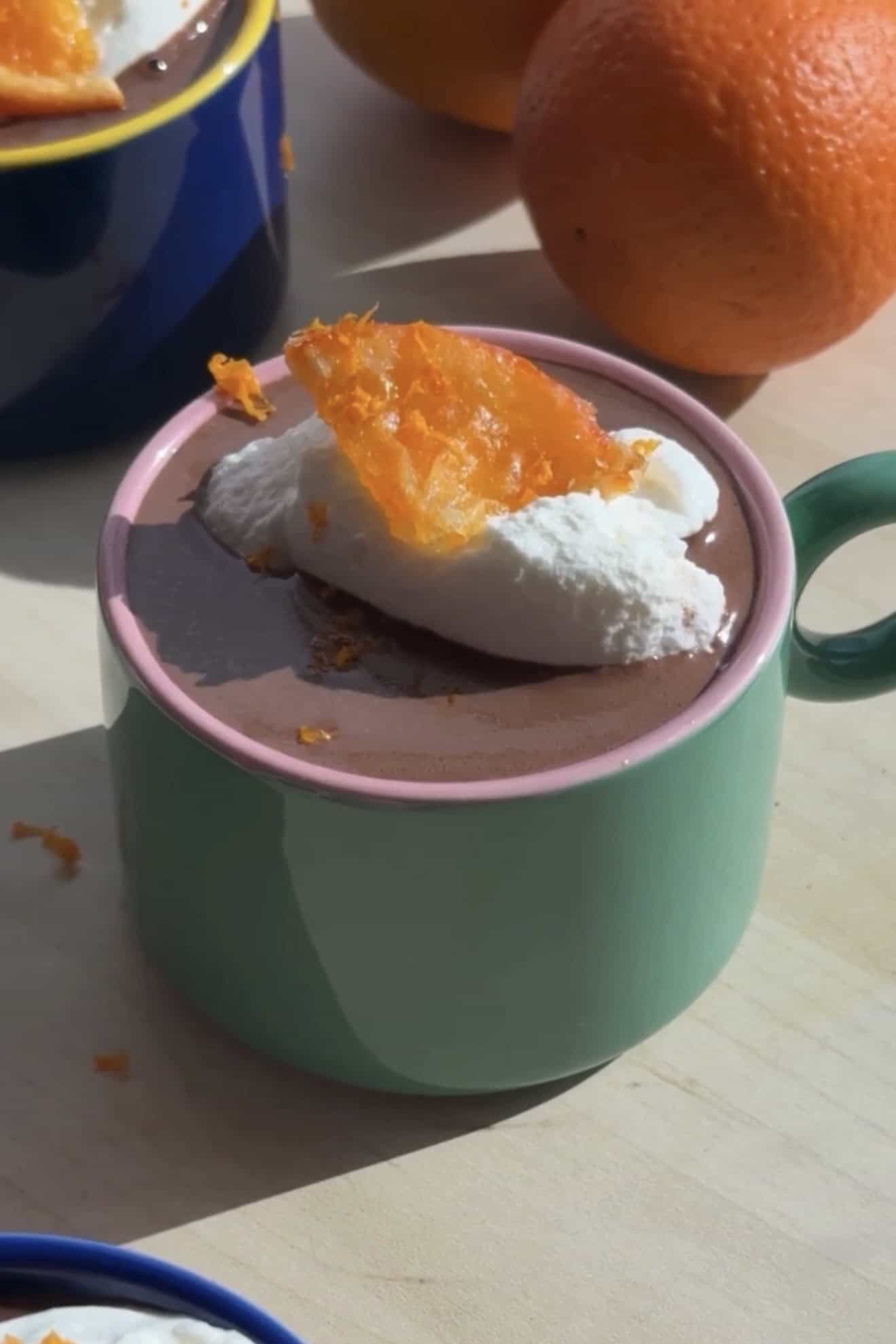 This recipe is inspired by those moments and the classic techniques I learned during my pastry school days. It creates a deeply rich, silky French hot chocolate that’s thick enough to feel luxurious but still perfectly drinkable. With the addition of some softly whipped cream and a slice of candied oranges, perfection.
